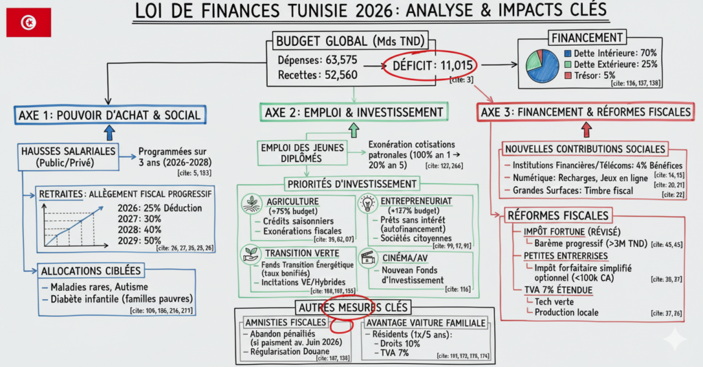 La loi de finances tunisienne 2026, promulguée le 12 décembre 2025, marque un tournant dans la politique économique tunisienne avec un budget total de 63,575 milliards de dinars en dépenses contre 52,560 milliards en recettes, soit un déficit de 11,015 milliards de dinars.