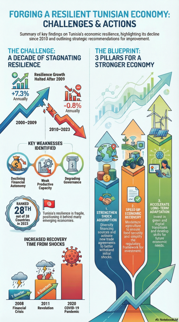 After diagnosing the state of Tunisia’s economic resilience, the ITCEQ report doesn’t stop there – it offers a blueprint of policy recommendations to strengthen Tunisia’s ability to withstand and bounce back from crises. Crucially, the report suggests that these reforms be structured around the same three capacities of absorption, recovery, and adaptation. By targeting each stage of resilience, Tunisia can build a comprehensive defense system against shocks: first absorbing the impact without collapse, then recovering quickly, and finally adapting and transforming to reduce vulnerability to future shocks. Below, we summarize the key recommended actions in each category, translated into accessible language, to show how Tunisia can move “from fragile to resilient.”